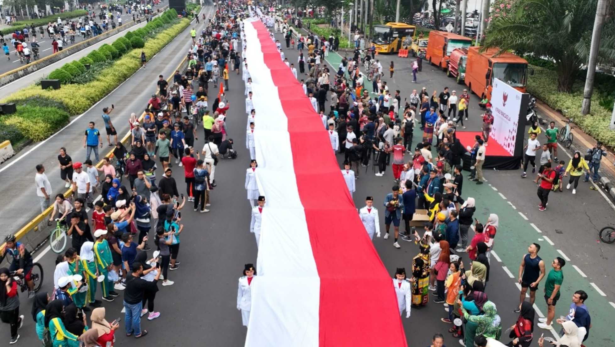 Kirab Pancasila, menjelang puncak peringatan Hari Lahir Pancasila 1 Juni 2024 itu ada yang berbeda dibandingkan tahun sebelumnya yaitu terbentangnya bendera merah putih sepanjang kurang lebih 300 meter sepanjang jalan Jenderal Sudirman.