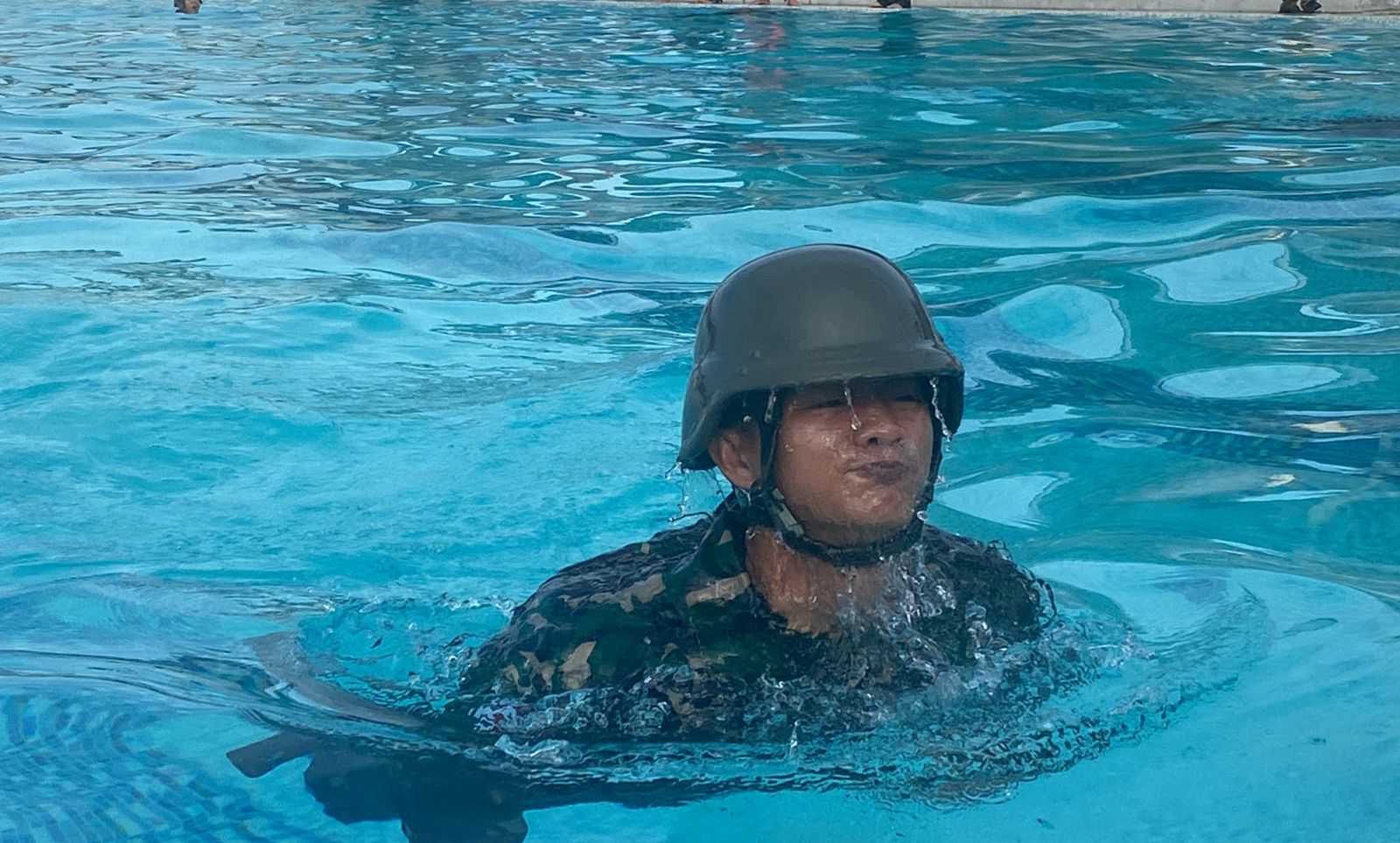 Sebelum renang dimulai, kegiatan diawali dengan senam pemanasan yang dilaksanakan untuk meminimalisir cidera saat berenang. Pelaksanaan renang militer kali ini mengambil jarak 50 meter dan dilaksanakan menggunakan perlengkapan perorangan meliputi Pakaian Dinas Lapangan (PDL), senjata organik dan helm tempur.