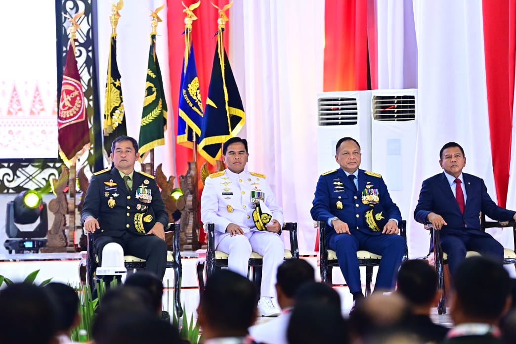 TNI AL, Belawan,- Komandan Pangkalan Utama TNI AL I (Danlantamal I) Brigjen TNI (Mar) Jasiman Purba, S.E., CHRMP., menghadiri Rapat Pimpinan (Rapim) TNI-Polri dipimpin Presiden RI Joko Widodo, dihadiri Menteri Koordinator Bidang Politik, Hukum, dan Keamanan (Menko Polhukam) Dr. (H.C.) Hadi Tjahjanto, S.I.P., Menteri Pertahanan (Menhan) Prabowo Subianto, Kepala Staf Kepresidenan (KSP) Dr. Moeldoko, S.I.P., M.A., Panglima TNI Jenderal TNI Agus Subiyanto, S.E., M.Si., Kapolri Jenderal Polisi Drs. Listyo Sigit Prabowo, M.Si., Kepala Staf Angkatan Darat (Kasad) Jenderal TNI Maruli Simanjuntak, M.Sc., Kepala Staf Angkatan Laut (Kasal) Laksamana TNI Dr. Muhammad Ali, S.E., M.M., M.Tr.Opsla., dan Kepala Staf Angkatan Udara (Kasau) Marsekal TNI Fadjar Prasetyo, S.E., M.P.P., C.S.F.A. dengan Tema “TNI-Polri Siap Wujudkan Pertahanan Keamanan Untuk Indonesia Maju”, bertempat di Gedung Olah Raga (GOR) Ahmad Yani Mabes TNI Cilangkap, Jakarta Timur, Rabu (28/2/2024).