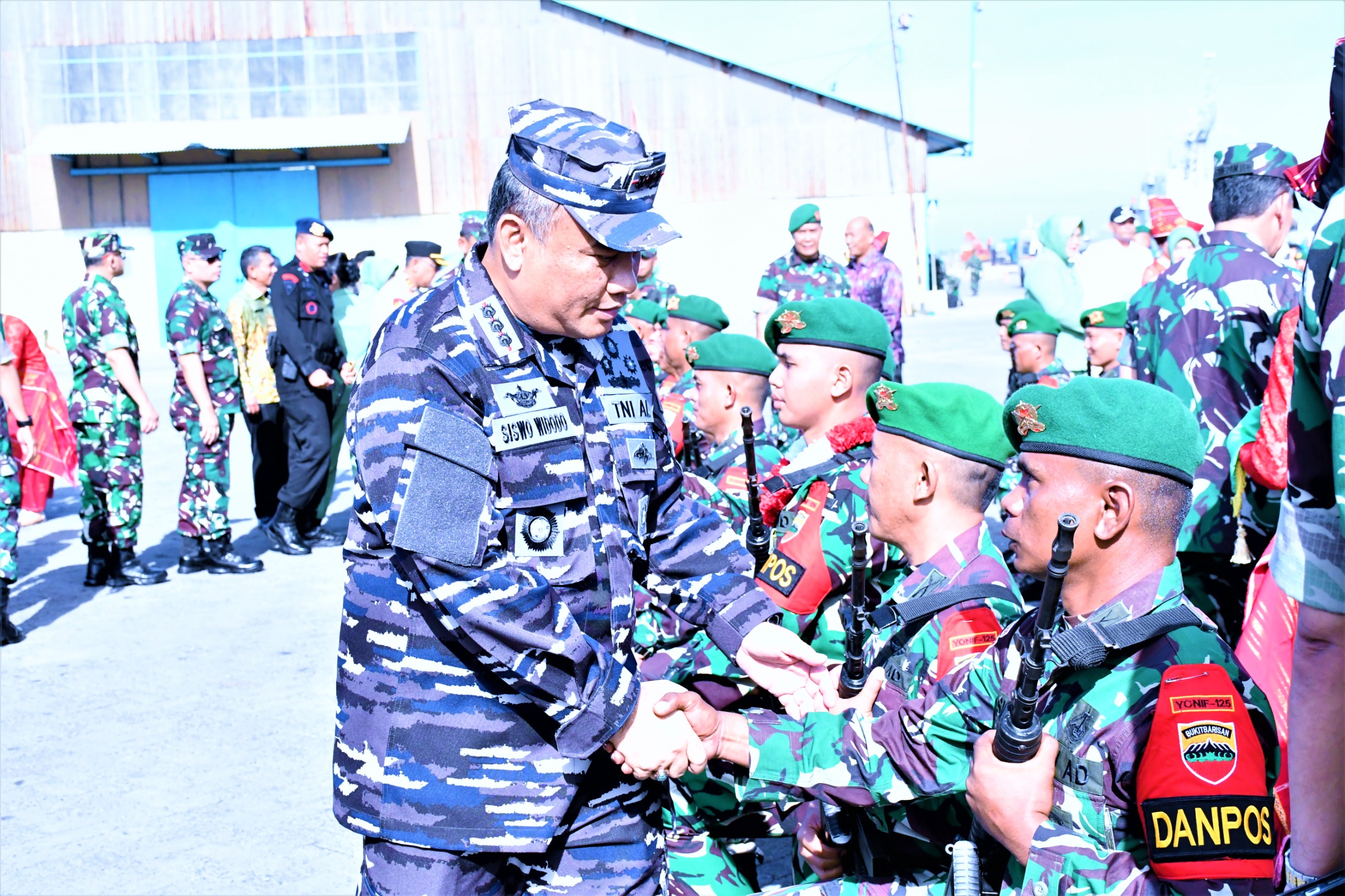 TNI AL, Belawan,- Komandan Pangkalan Utama TNI Angkatan Laut I (Danlantamal I) Brigjen TNI (Mar) Jasiman Purba, S.E., CHRMP., diwakili Wadan Lantamal I Kolonel Laut (P) Siwo Widodo, S.T., didampingi Wakil Ketua Korcab I DJA I Ny. Maria Siswo Widodo, dan FKPD Provinsi Sumatera Utara beserta istri, menghadiri Upacara Penyambutan Purna Tugas Pamtas Kewilayahan Yonif 125/Simbisa Tahun 2023-2024, dipimpin Pangdam I Bukit Barisan Mayjen TNI Mochammad Hasan, bertempat di Dermaga 103, Belawan, Sumatera Utara, Kamis (19/9/2024).