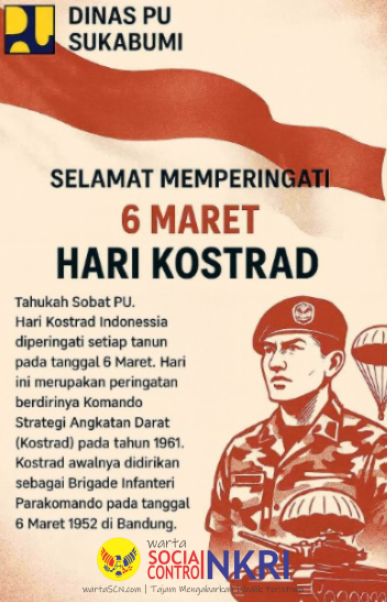WartaSCN.com, Sukabumi – Dalam semangat penghormatan terhadap kekuatan pertahanan dan sejarah militer Indonesia, Dinas Pekerjaan Umum (PU) Sukabumi turut memperingati Hari KOSTRAD yang jatuh pada tanggal 6 Maret. Peringatan ini menjadi momentum penting untuk mengenang berdirinya Komando Strategi Angkatan Darat (KOSTRAD), salah satu komponen utama dalam sistem pertahanan nasional.