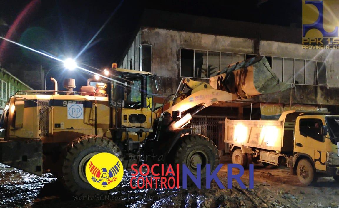 Wartascn.com, Aceh Tamiang — Upaya pembersihan pascabanjir bandang dan longsor di Kabupaten Aceh Tamiang terus dikebut. Hingga larut malam, tim penanggulangan bencana dari Kemeterian Pekerjaan Umum (PU) dan relawan mengerahkan alat berat untuk membersihkan material sisa banjir yang menutup jalan nasional.