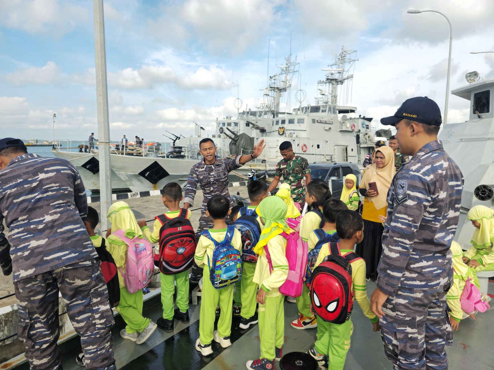 TNI AL, Bintan,- Antusiasme Siswa/Siswi Paud Nurul Istiqomah, Lobam, Seri Kuala Lobam, Bintan, bisa melihat dan naik Kaapal Perang Republik Indonesia atau KRI dengan pengawasan oleh Prajurit Lanal Bintan dan Prajurit KRI Clurit-641 yang saat ini sandari di Dermaga Lanal Bintan Tanjung Uban, Sabtu (15/02/2025).