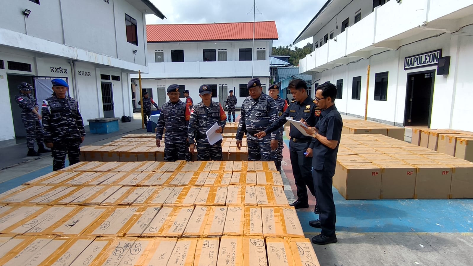 Penyerahan barang bukti rokok illegal hasil penangkapan oleh Tim Fleet One Quick Respon (F1QR) sebanyak 223 Bal dilengkapi Berita Acara dan pengecekan ulang terhadap barang bukti rokok illegal dengan cara dibongkar setiap ball dengan disaksikan pejabat yang hadir dalam acara penyerahan diantaranya Danlanal Tarempa, Pgs. Palaksa, Pasintel, Pgs. Pasops, Dandenpomal, Perwira Staf dan Tim F1QR Lanal Tarempa, Kepala Kantor Bantu Bea dan Cukai Tarempa beserta Staf.
