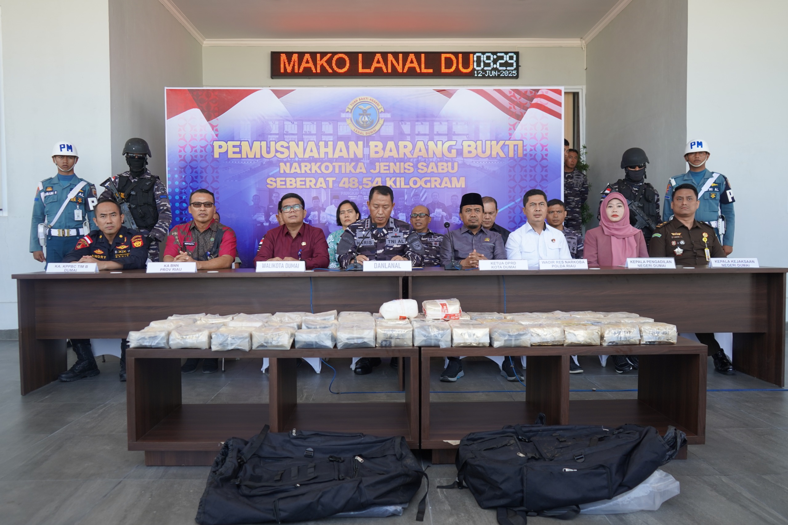 TNI AL, Dumai,- Dalam upaya nyata memberantas peredaran narkoba di Indonesia, Pangkalan TNI Angkatan Laut (Lanal) Dumai menggelar acara pemusnahan barang bukti narkotika jenis sabu seberat 48,54 Kg di Mako Lanal Dumai, Jalan Yos Soedarso No.01, Kota Dumai. Acara ini dipimpin langsung oleh Komandan Lanal Dumai Kolonel Laut (P) Abdul Haris S.E., M.M.D.S., yang didampingi oleh (PJU) Lanal Dumai, Kamis (12/6/2025).