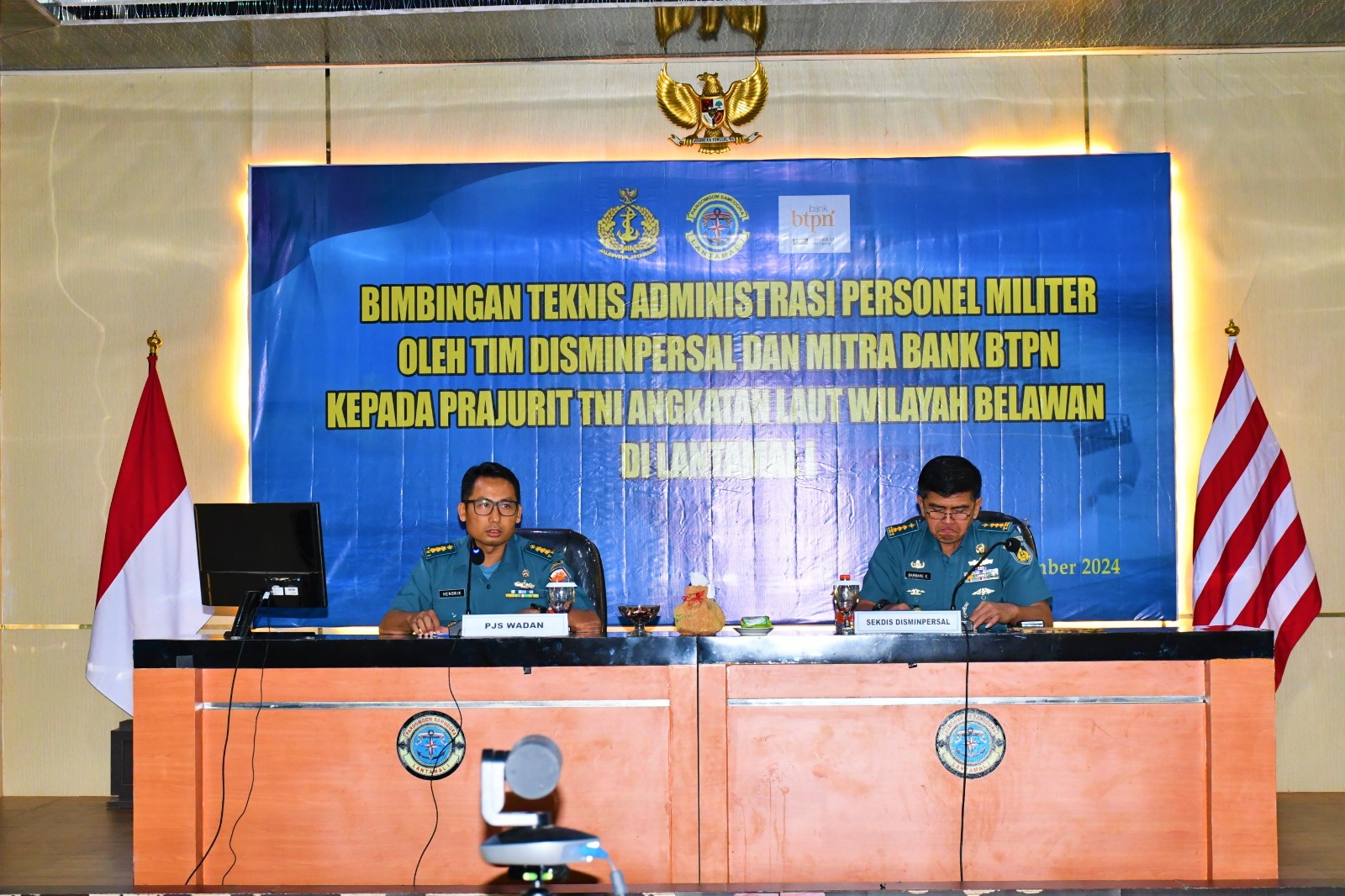 TNI AL, Belawan,- Komandan Pangkalan Utama TNI Angkatan Laut I (Danlantamal I) Brigjen TNI (Mar) Jasiman Purba, S.E., CHRMP., yang di wakili Pjs. Wadan Lantamal I Kolonel Laut (P) Hendrik Kurniawan, M.Tr. Hanla., M.M., menghadiri Bimbingan Teknis Administrasi Personel Militer oleh Tim Disminpersal yang dipimpin Sekdisminpersal Kolonel Laut (P) Bambang Kuncoro, S.T., M.Si., mewakili Kepala Dinas Administrasi Personel TNI AL Laksamana Pertama TNI Uki Prasetia, S.T., M.M., dan Sosialisasi Pengelolaan Keuangan oleh PT. Asabri dan Mitra Bank BTPN kepada Prajurit TNI Angkatan Laut wilayah Lantamal I Tahun 2024, bertempat di Gedung OB Sya’af Mako Lantamal I, Jalan Serma Hanafiah No.01 Belawan, Sumatera Utara, Kamis (26/9/2024).