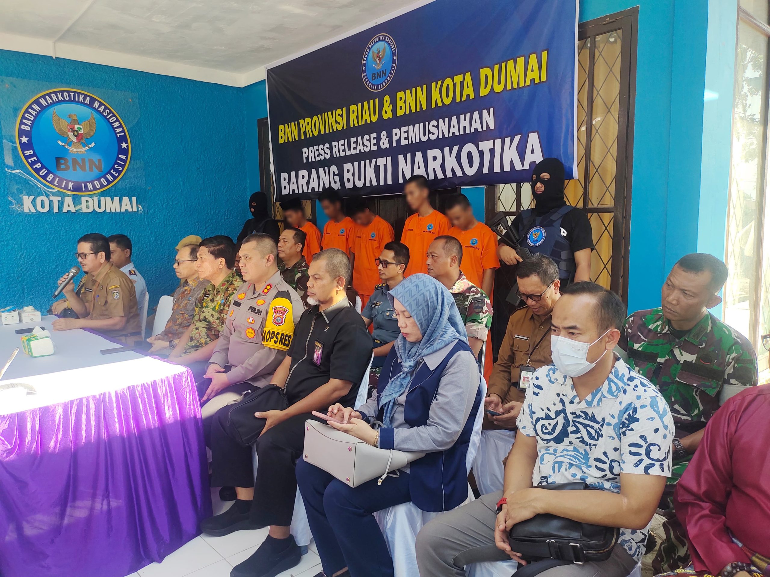 Acara pemusnahan Barangan Bukti dihadiri Kepala BNN Provinsi Riau Brigjen Pol Robinson D.P. Siregar, Walikota Dumai diwakili Sekda Kota Dumai H. Indra Gunawan, S.IP, M.SI., FKPD Kota Dumai, Penasehat Hukum Tersangka dan Tokoh Masyarakat, serta awak media.