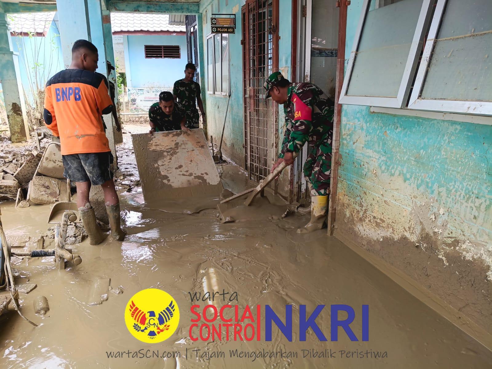 Anggota TNI, Polri, Relawan dan Warga bekerja sama membersihkan lumpur dan sisa material banjir di wilayah Aceh Utara dan Aceh Tamiang.