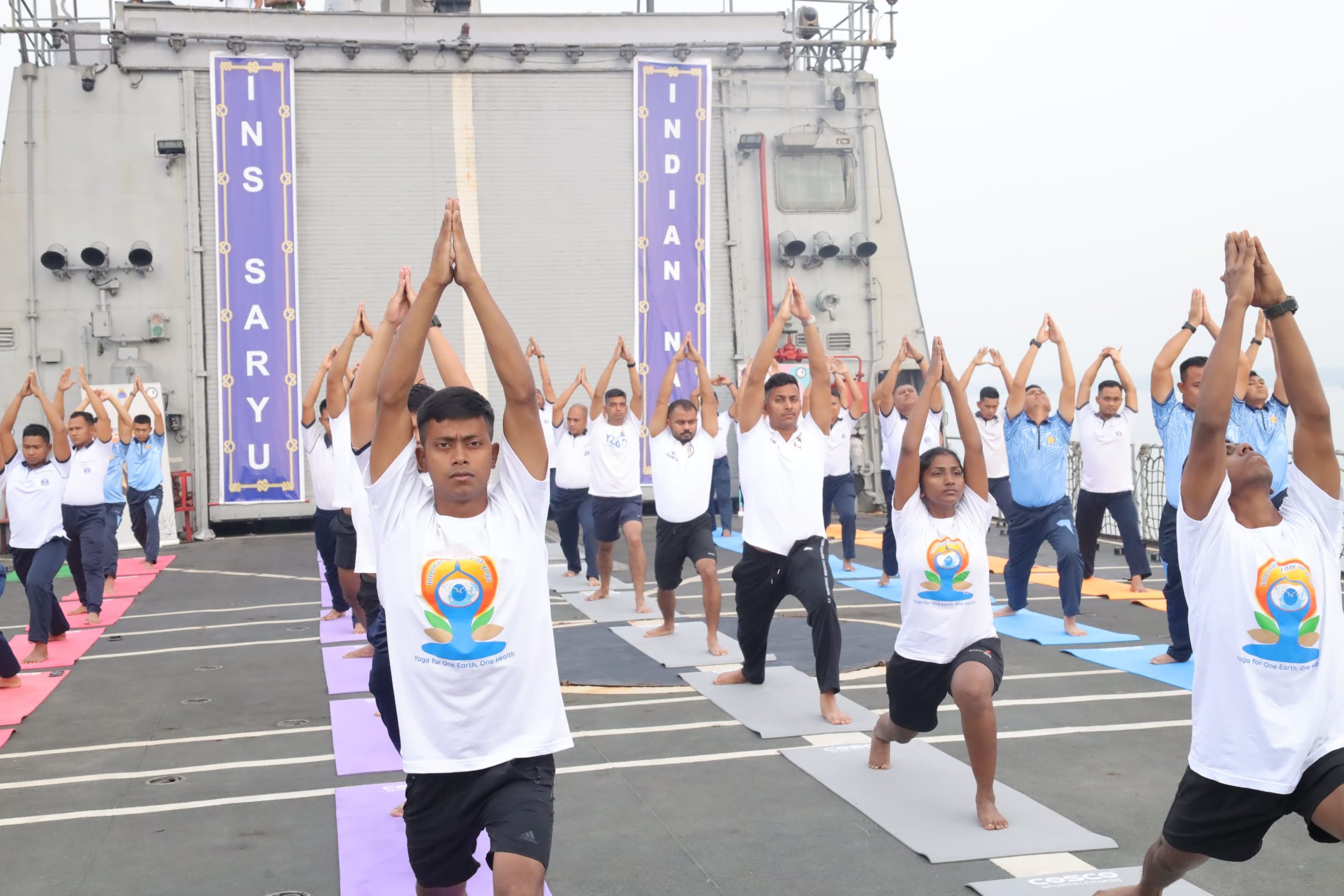TNI AL, Belawan,- Personel Pangkalan Utama TNI Angkatan Laut I (Lantamal I) melaksanakan olahraga bersama Senam Yoga dengan ABK Kapal Perang India INS Saryu P54, bertempat di Deck Kapal dan Dermaga Pelindo 104 Belawan, Sumatera Utara, Sabtu (21/6/2025).