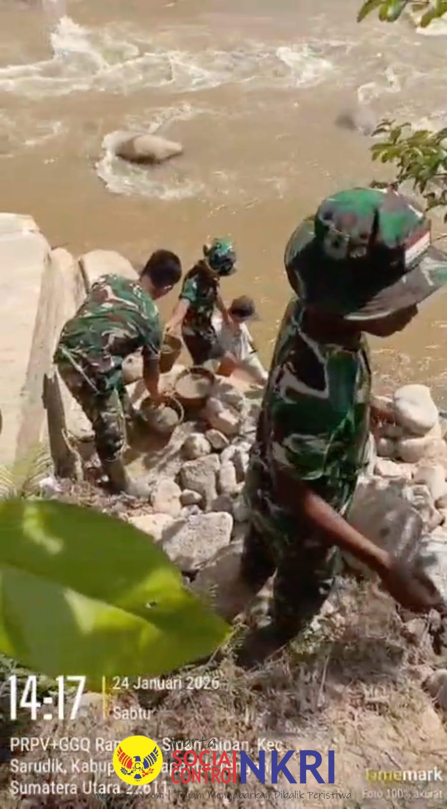Adukan semen kemudian dituangkan ke dalam ember-ember kecil. Para personel TNI lalu mengoper ember berisi semen itu satu per satu, membentuk rantai manusia untuk mempercepat proses pengecoran di sisi sungai.