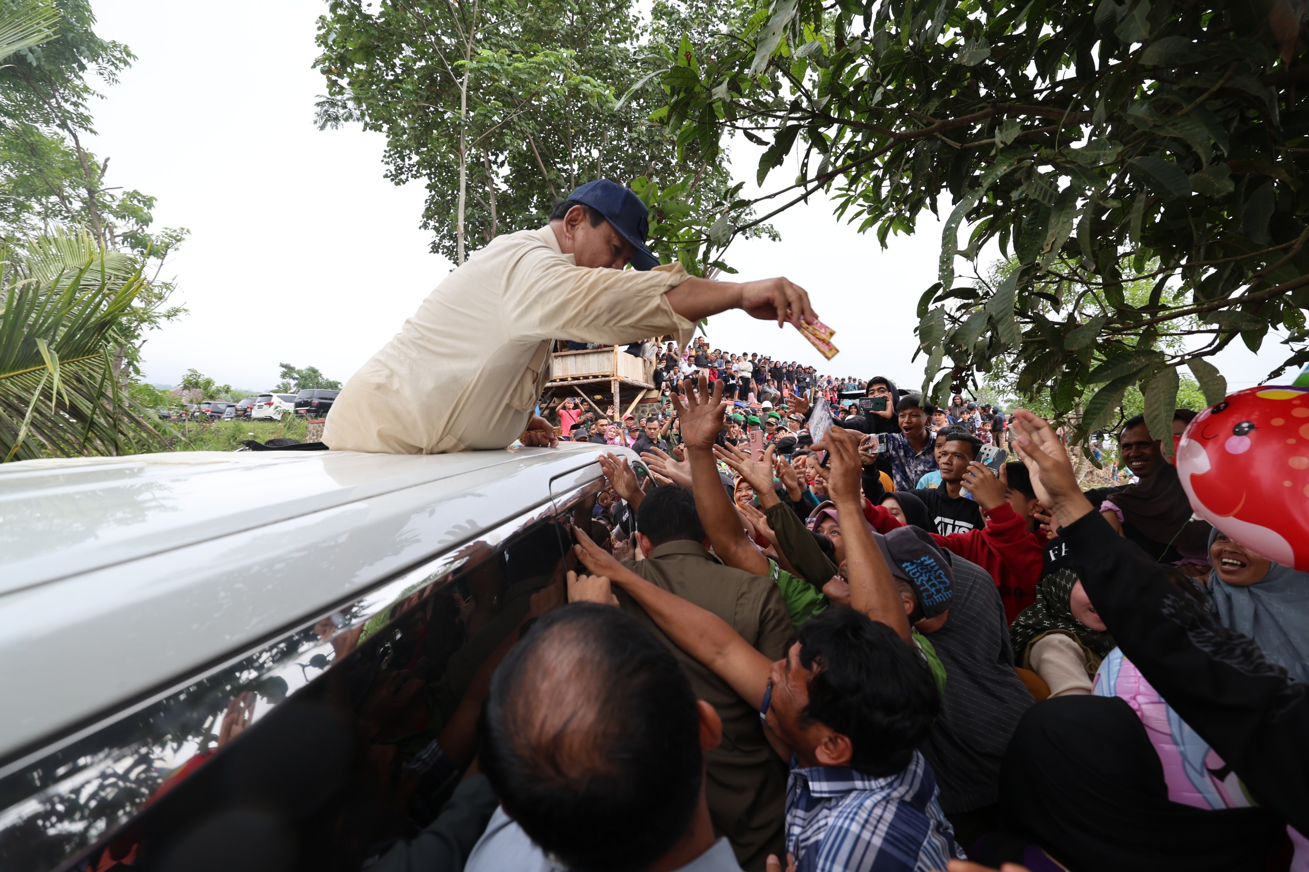 Seketika, Prabowo membuka sunroof kendaraan mobilnya dan nampak keluar dengan tersenyum seraya menggenggam sejumlah cokelat yang ia berikan kepada anak-anak dan warga setempat.