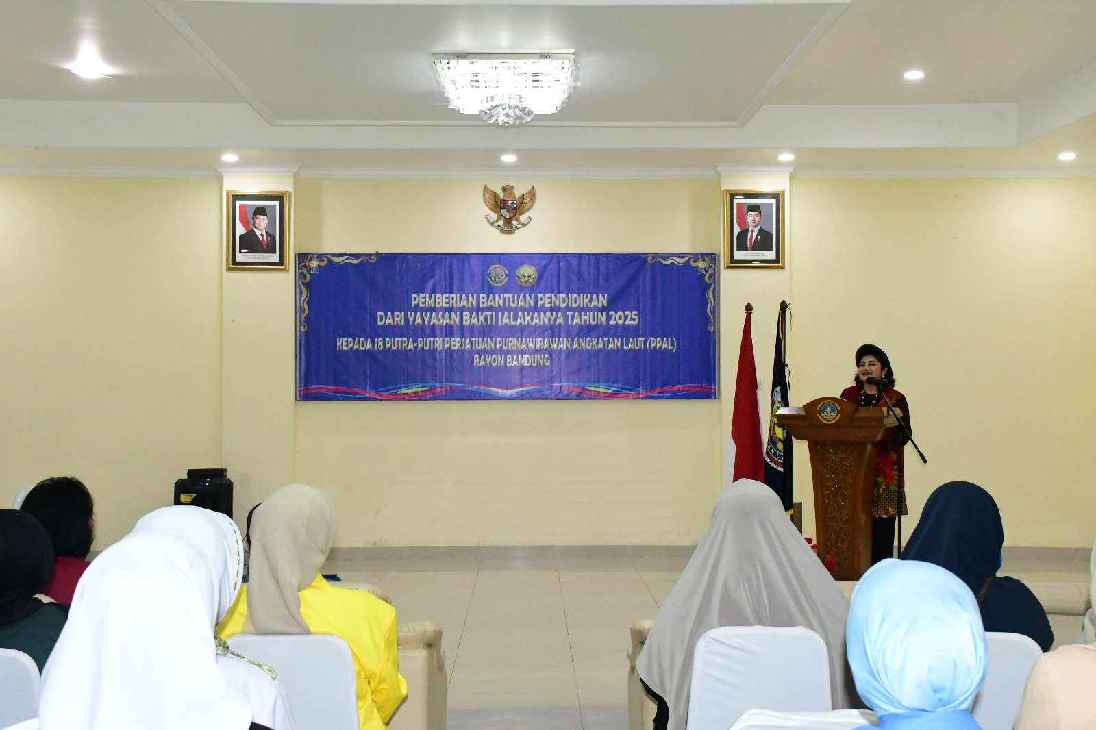TNI AL, Bandung,- Guna membantu putra-putri Purnawirawan TNI Angkatan Laut Rayon Bandung, Ketua Umum Yayasan Bakti Jalakanya Ny. Tetty Agus Suhartono yang didampingi Komandan Lanal Bandung Kolonel Laut (P) Muhammad Taufik, M.Tr.Hanla., M.M., memberikan beasiswa kepada putra-putri Purnawirawan TNI AL Rayon Bandung, bertempat di Mess TNI AL R.E. Martadinata, Jalan Setiabudi No. 73 Kota Bandung, Senin (23/06/2025).