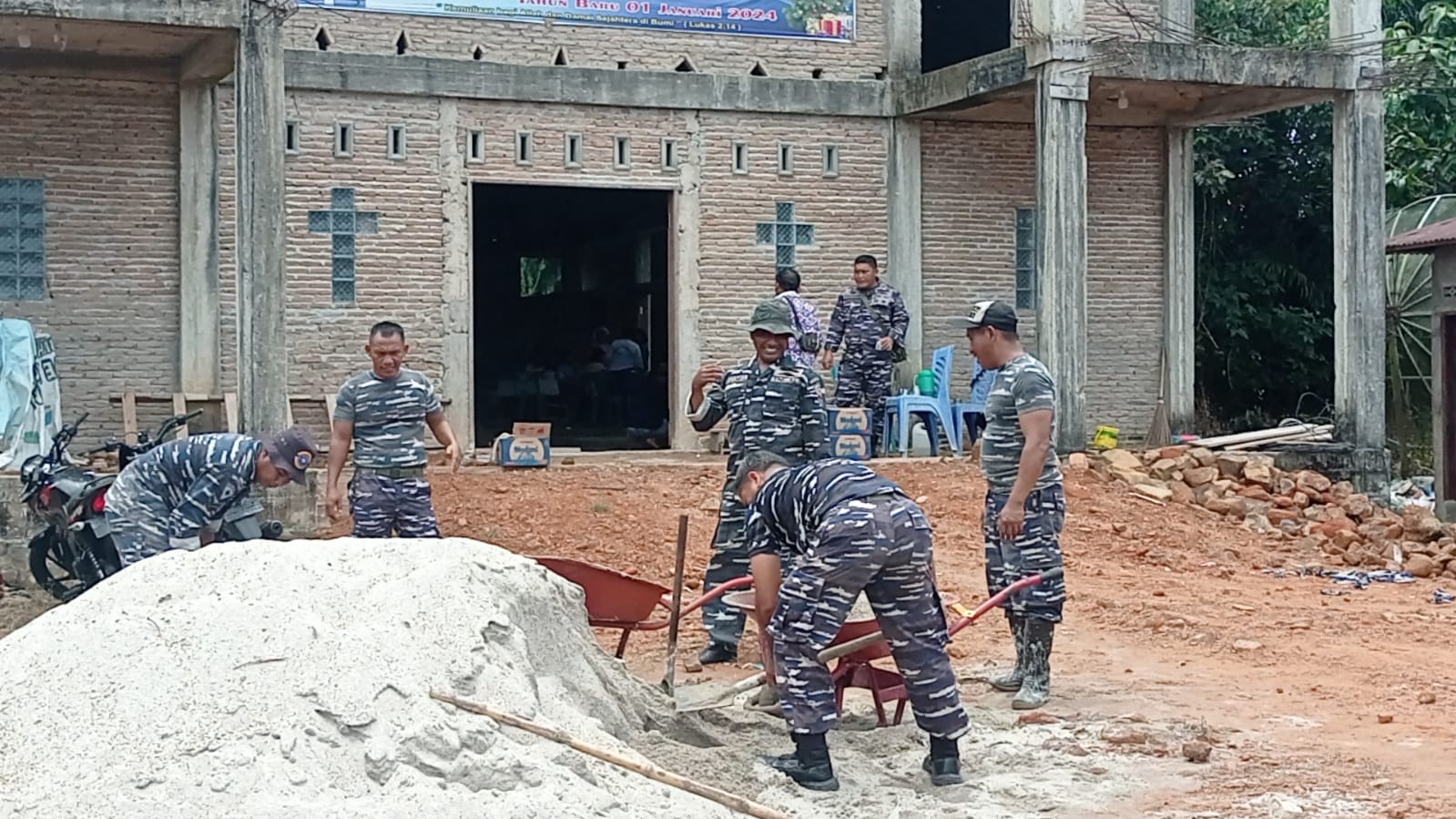 Lanal Sibolga juga memberikan dukungan materil berupa 40 sak semen dan 10 kubik kerikil, setelahnya baru dilaksanakan gotong royong pengecoran lantai gereja oleh Prajurit Lanal Sibolga dan masyarakat sekitar.