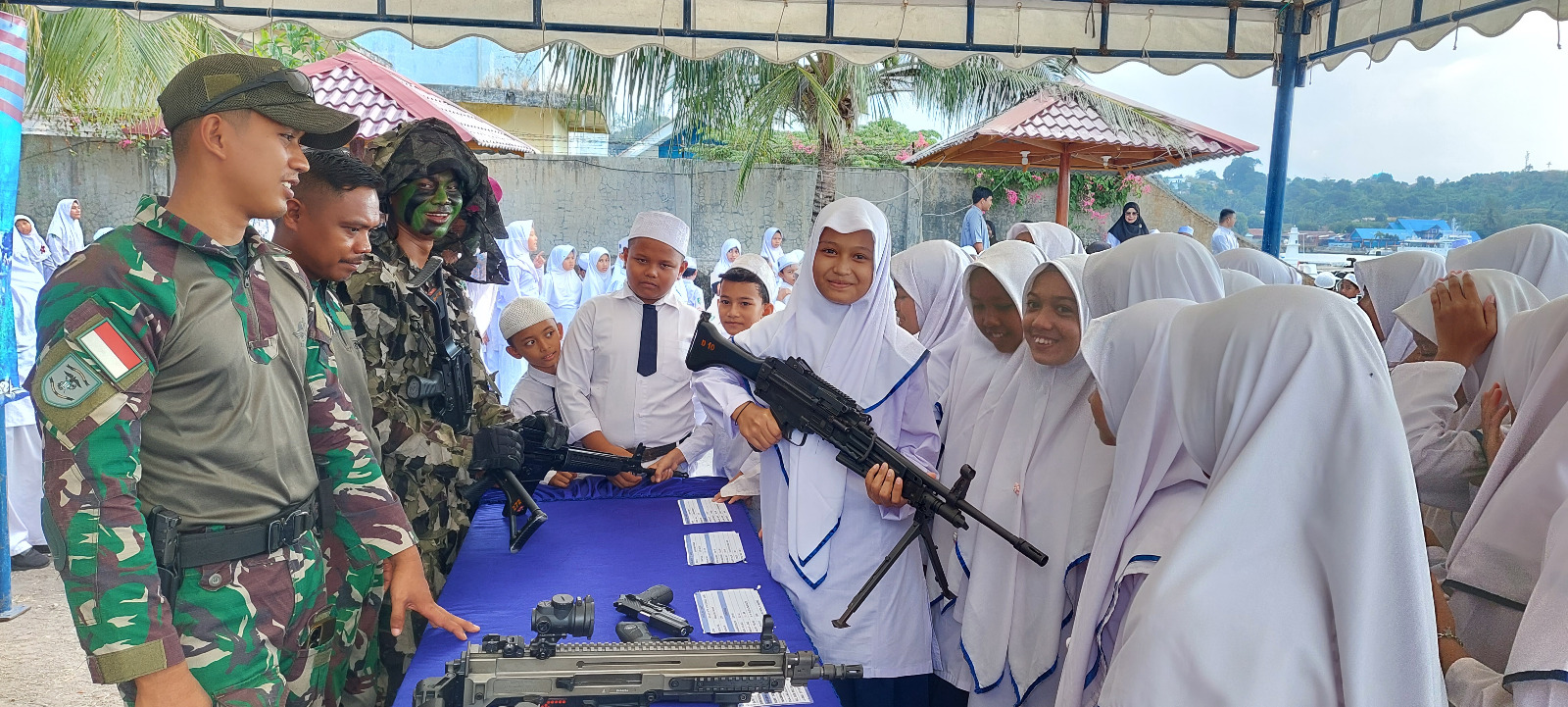 Para pelajar terlihat sangat antusias mendatangi dan melihat berbagai jenis senjata yang dipajang oleh Prajurit Marinir yang tergabung dalam Satgas Trisila TNI AL 2024. Mereka menyimak penjelasan yang diberikan oleh Prajurit Marinir mengenai tipe senjata dan amonisi yang dipamerkan, bahkan beberapa diantara mereka bertanya fungsi senjata dan tidak ketinggalan mengabadikan diri menggunakan senjata tersebut.