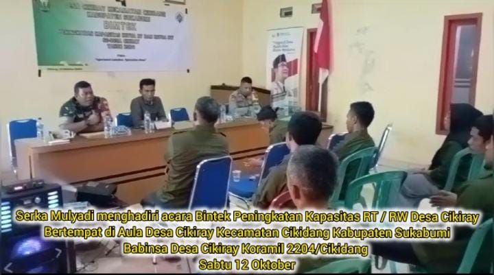 Sukabumi – Babinsa Desa Cikiray Koramil 2204/Cikidang Serka Mulyadi menghadiri acara Bintek Peningkatan Kapasitas RT / RW Desa Cikiray bertempat di Aula Desa Cikiray Kecamatan Cikidang Kabupaten Sukabumi, Sabtu 12 Oktober.