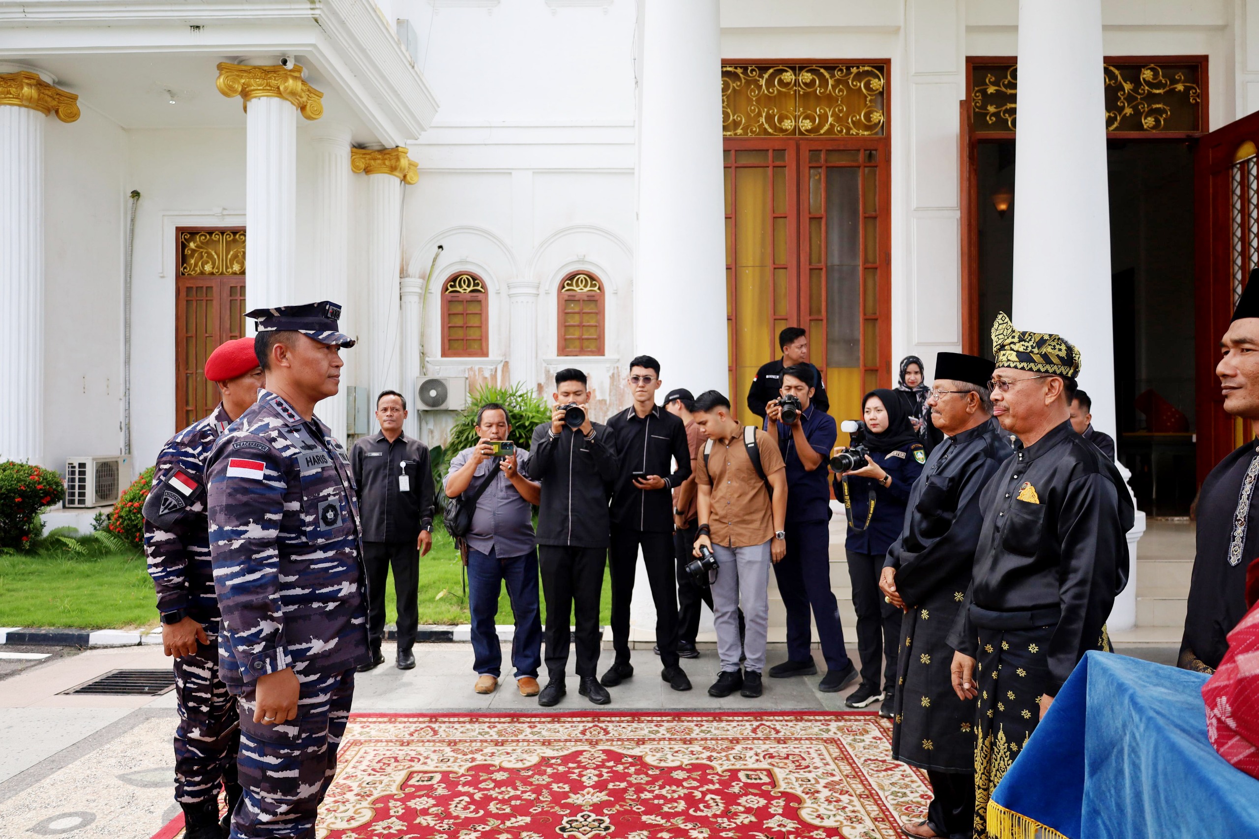 TNI AL, Bengkalis,- Hangat dan penuh penghormatan, Wakil Bupati Bengkalis Dr. H. Bagus Santoso bersama Forkopimda Kabupaten Bengkalis sambut kedatangan Danlanal Dumai Kolonel Laut (P) Abdul Haris S.E., M.M.D.S., beserta rombongan. Dengan tradisi khas tabuhan kompang serta pemasangan tanjak, Danlanal Dumai disambut di Wisma Daerah Sri Mahkota Bengkalis, Senin (19/5/2025).