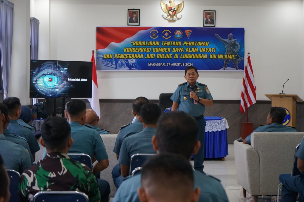 TNI AL, Makassar,- Personel Satuan Lintas Laut Militer (Satlinlamil) 3 dan ABK KRI Teluk Hading-538 menerima Sosialisasi tentang Peraturan Konservasi Sumber Daya Alam Hayati dari Balai Konservasi Sumber Daya Alam (BKSDA) Sulawesi Selatan, Pencegahan Judi Online dari Pomal Kolinlamil, dan Rekam Jejak Digital dari Disinfolahta Kolinlamil, bertempat di Ruang Rapat Mako Satlinlamil 3, Jalan Teuku Umar, Makassar, Selasa (27/8/2024).