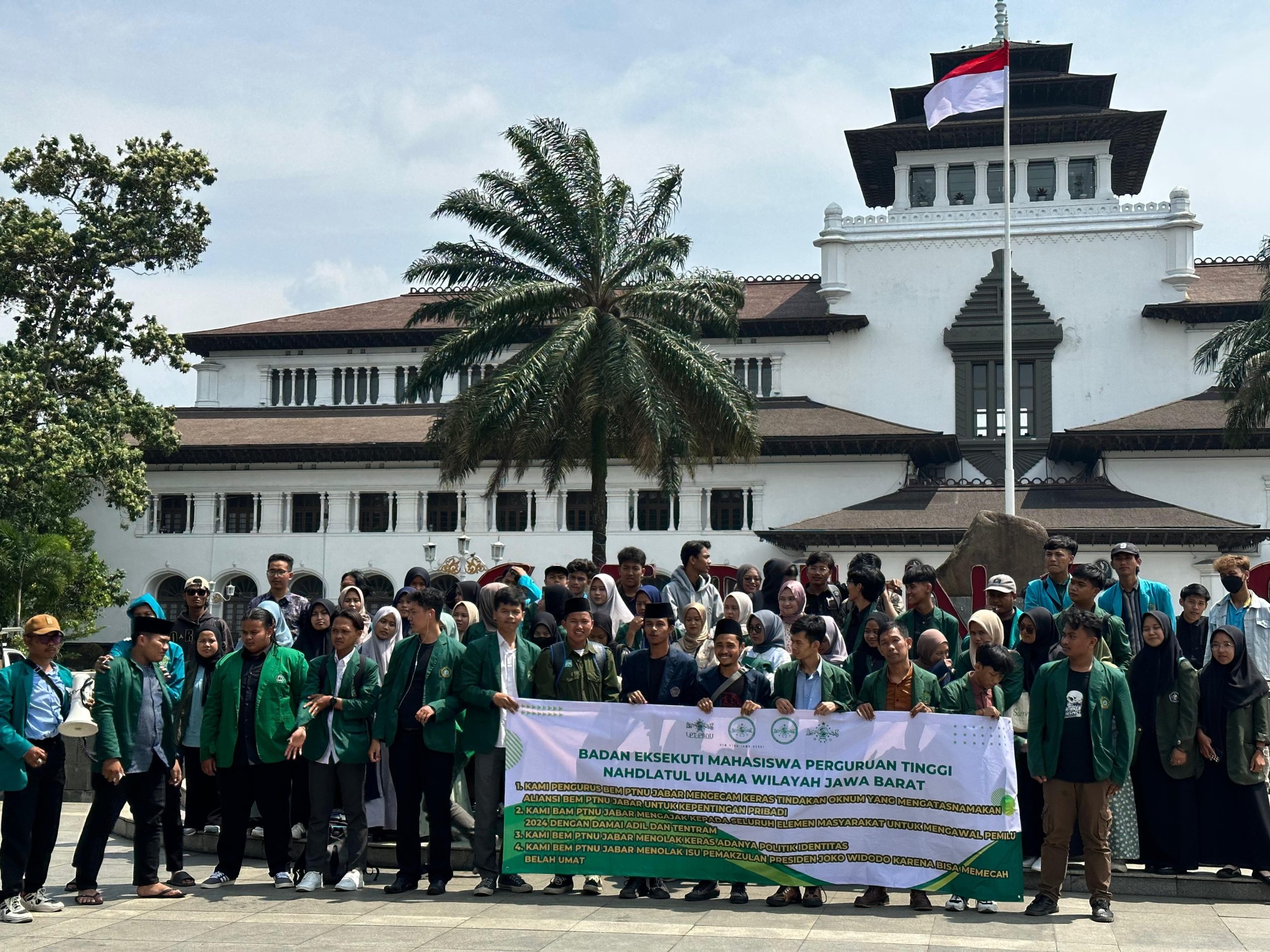 Bandung – Badan Eksekutif Mahasiswa Perguruan Tinggi Nahdlatul Ulama (BEM PTNU) Se-Nusantara Wilayah Jawa Barat Adakan Seminar Nasional yang bertema “aksi nyata bakti mahasiswa NU dalam menjaga stabilitas dan kesatuan NKRI” di Gedung Dakwah PWNU Jawa Barat dan deklarasi Pemilu Damai di depan gedung sate Bandung, Sabtu (26/1).