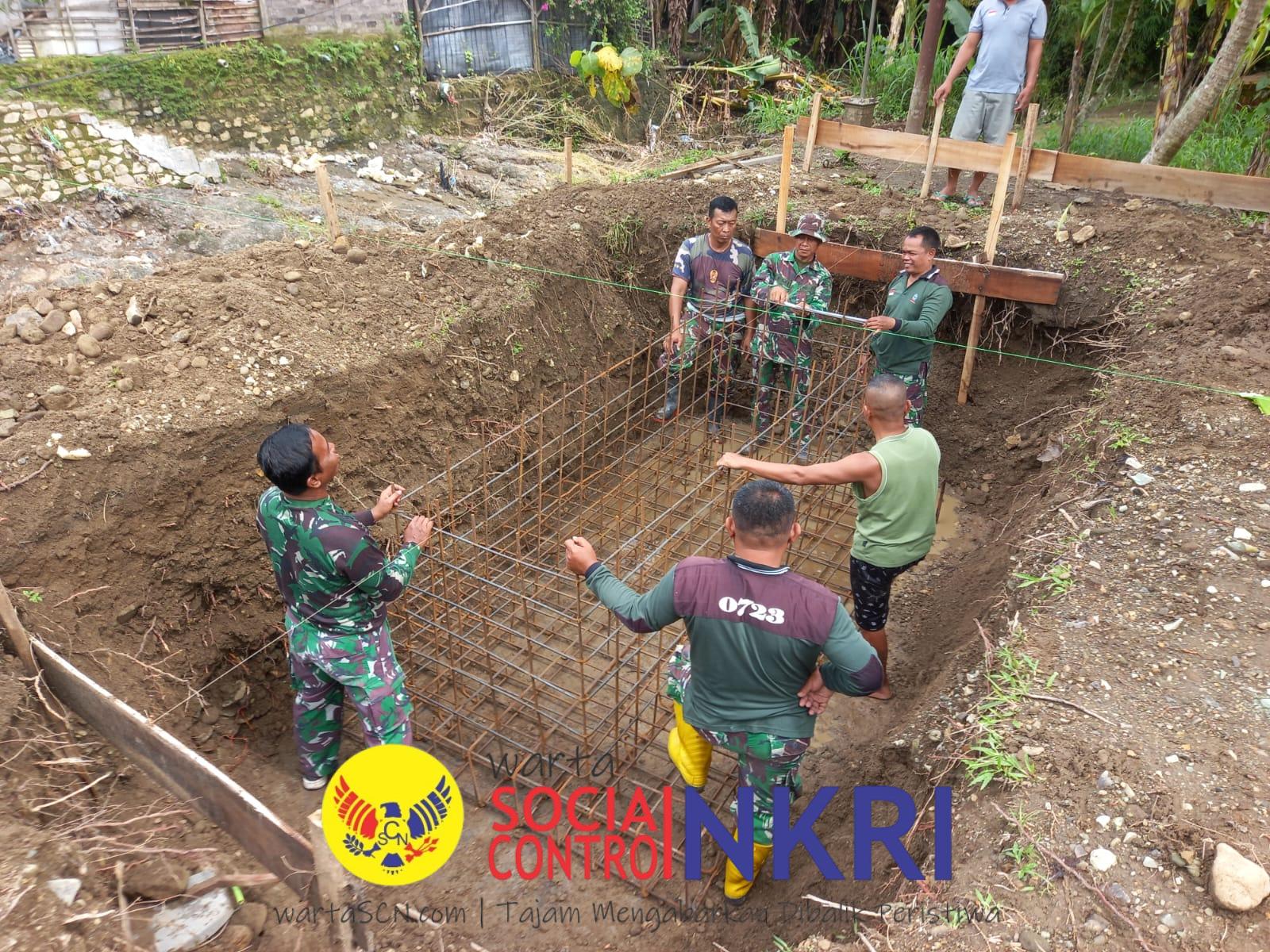 Sejumlah personel terlihat mengeruk tanah di sisi sungai menggunakan ekskavator sebagai titik fondasi utama jembatan. Selanjutnya, mereka pun dibantu warga untuk memasang kerangka besi dan mengecor dengan semen agar struktur lebih kokoh.